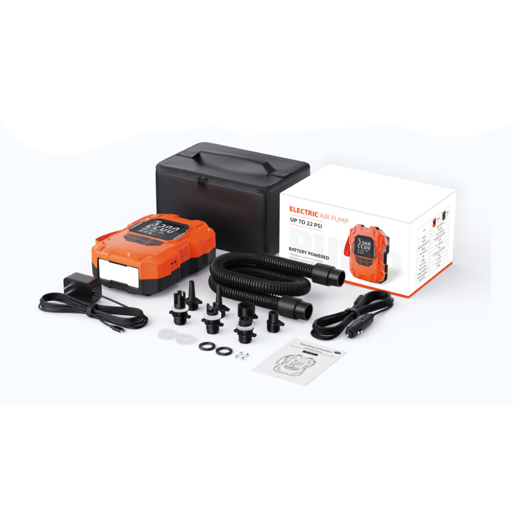 Součást balení: pumpa, hadice na nafukování, 7 nástavců, kabel DC, USB-C nabíjecí kabel, přepravní taška.
